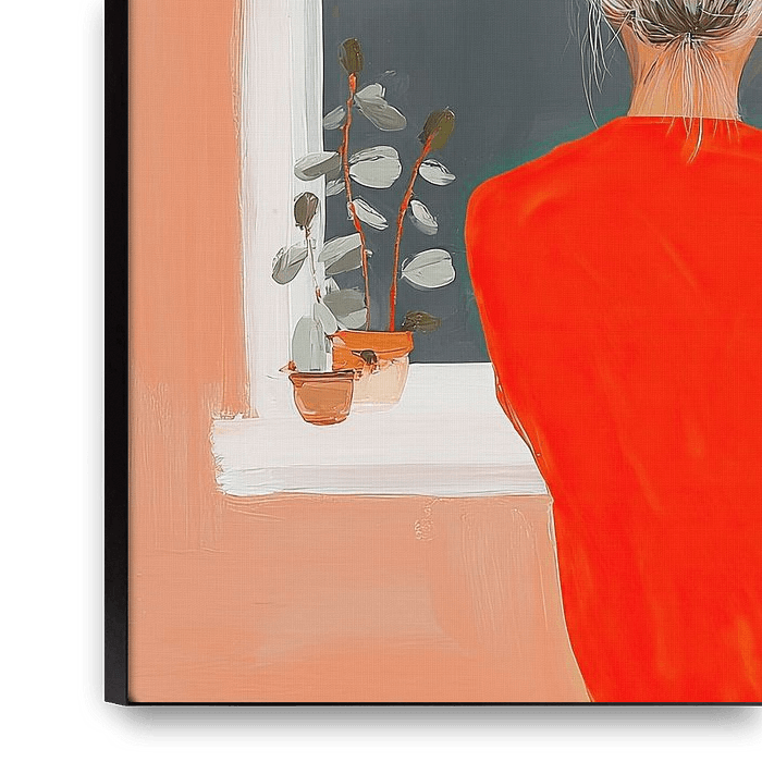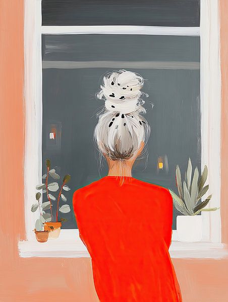 This artwork captures a quiet and intimate moment of stillness, portraying a woman seen from behind as she gazes out of a window into the evening. Dressed in a vivid red garment, her figure becomes the emotional focal point of the composition, standing in calm contrast to the muted grey tones of the night outside. The softly gathered…