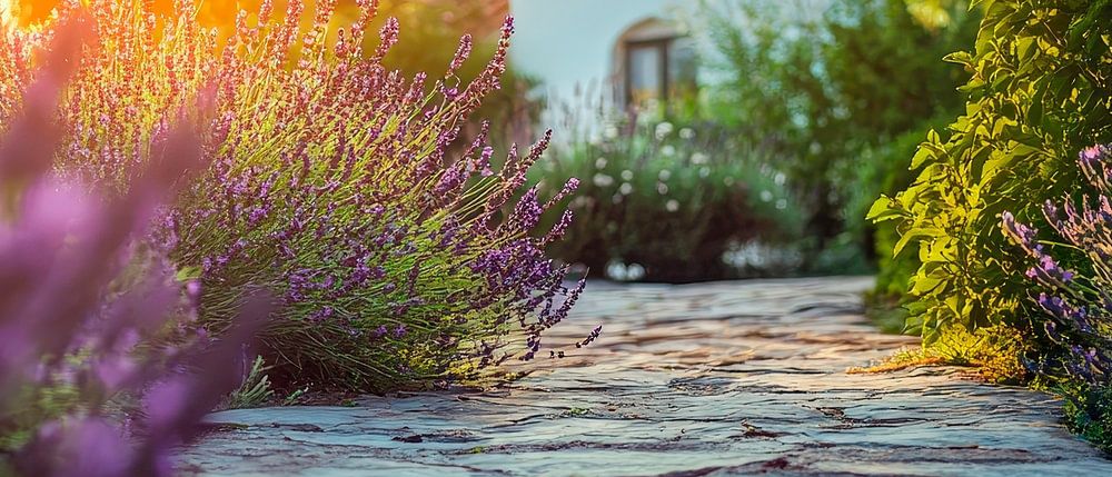 A picturesque garden path, surrounded by delicate lavender flowers and soft light, creates an idyllic atmosphere. The warm colours of the setting sun lend the scenario an inviting calm. This work of art is perfect for the living room to create a harmonious, relaxing mood and let your mind wander.