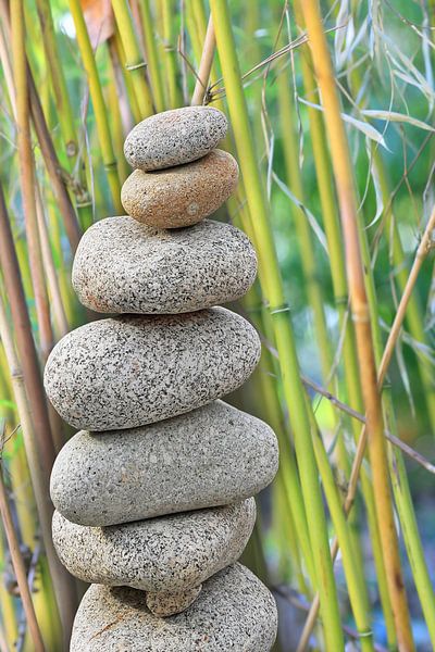 Stone tower and background made of green bamboo cane