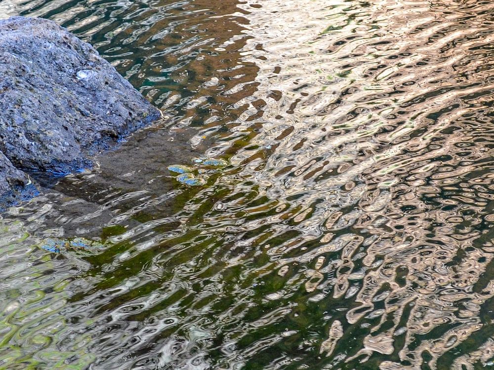 In the middle of the town of Ronda in Spain, runs a deep gorge with a small river. Down by the water, you can see the patterns, colours, shadows and reflections, and get lost in them! In the rippling water, you can see the rocks of the gorge and the houses above reflected. It creates a soothing image to look at again and again.