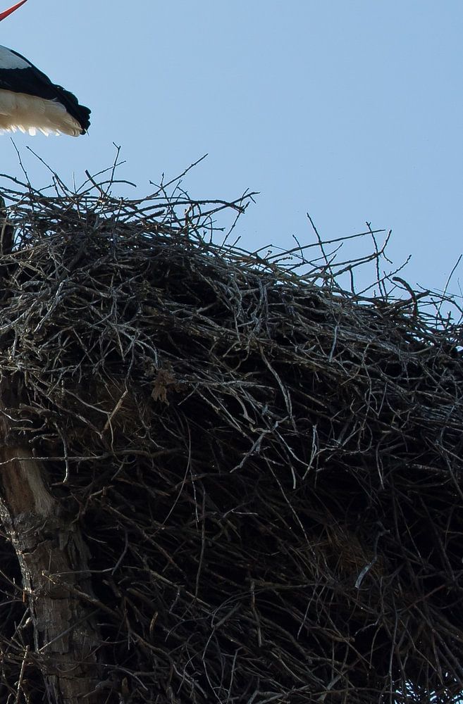 This stork sits on the giant natural nest clattering. They do this flapping with their long bill and especially early in spring. this is to greet another stork. They often breed on special stork poles, but this pair have been breeding on this huge natural nest along the canal and a major road for years.