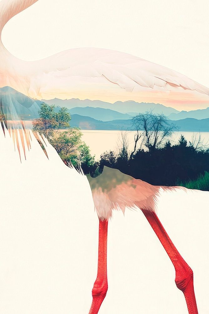 An elegant stork wanders through a dreamlike landscape that comes to life in its plumage. The harmonious colours and detailed depiction give the picture a calming aura that invites you to dream. Ideal for the bedroom, it creates a peaceful atmosphere and combines nature with style.