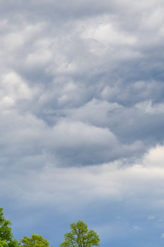 Storm clouds chasing over the fresh green meadows behind trees in the background. The dark thunderstorm clouds are drifting over the fields in the IJsseldelta region in Overijssel, The Netherlands.