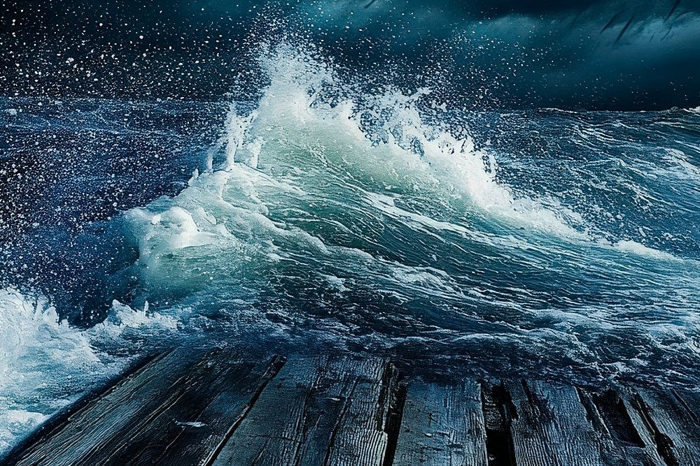 Stormy waves crash wildly against a weathered jetty, while the sky is covered in dramatic, dark clouds. This powerful scene radiates a powerful energy that evokes calm and excitement at the same time. Ideal for a living room or study, it brings the unbridled power of nature into the home and encourages reflection.
