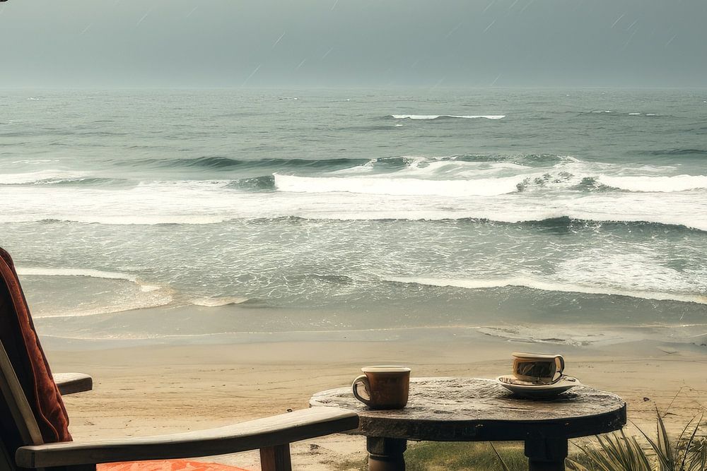 A cup of coffee, whose warm vapour merges into the cool sea air, sits on the small table, as if someone has just left for a moment and will return at any moment. The view of the wild, grey sea and beach, now almost deserted, is punctuated by the gentle rain that shrouds the landscape in a mist of mystery.