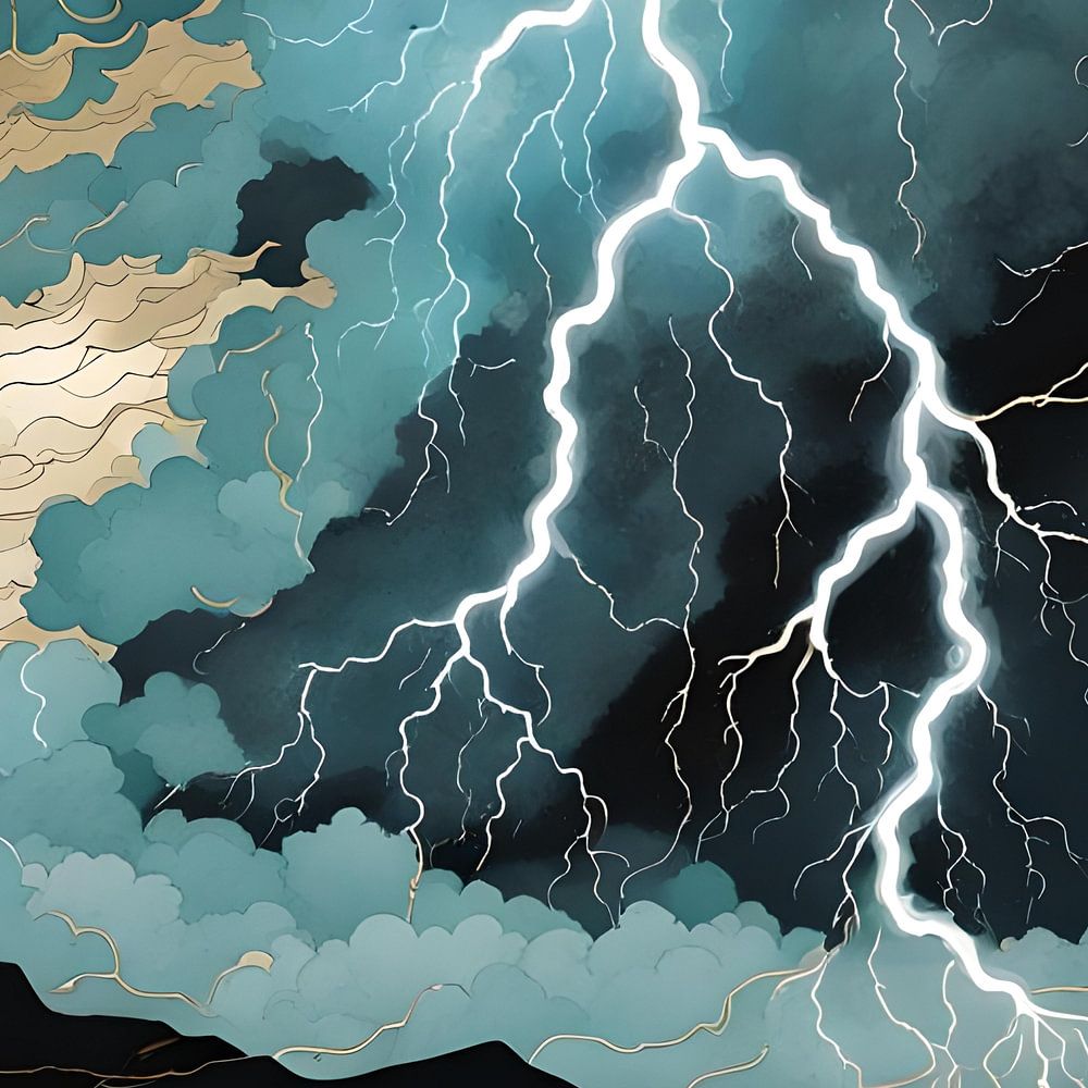 This graphic and line artwork shows a stormy sky in shades of grey and blue, laced with gold accents and a luminous, bright lightning bolt. The modern artwork, generated by AI, captures an intense moment where the power of nature comes alive. The sky is dramatic and dynamic, with the lightning bolt as an impressive centrepiece. This artwork offers a sense of the power and majesty of the natural elements. The decorative and stylish look makes this piece a perfect addition to any room looking for an impressive and modern artwork.