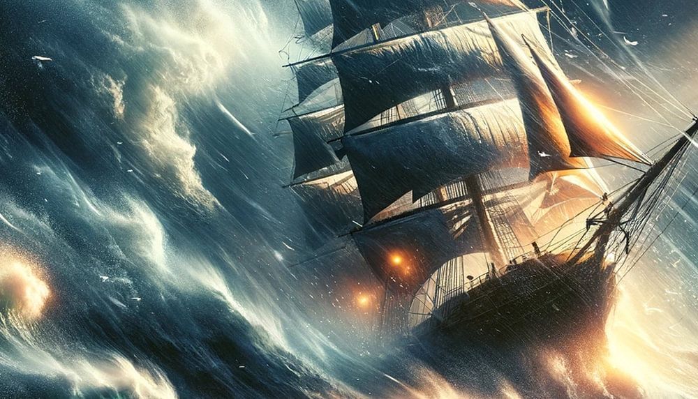 In this dramatic image, we witness a sailing ship standing its ground in the middle of a raging storm. The sea around it boils in an explosion of waves that rise into the sky like liquid mountains. Glowing lights on board the ship cast eerie shadows and form a sharp contrast to the dark waters. The sky seems to reflect the fury of the sea, while lightning flashes through the clouds and transforms the sea into a luminous spectacle. Despite the violent turmoil, the ship navigates resolutely through the chaotic sea, symbolising courage and unwavering willpower.