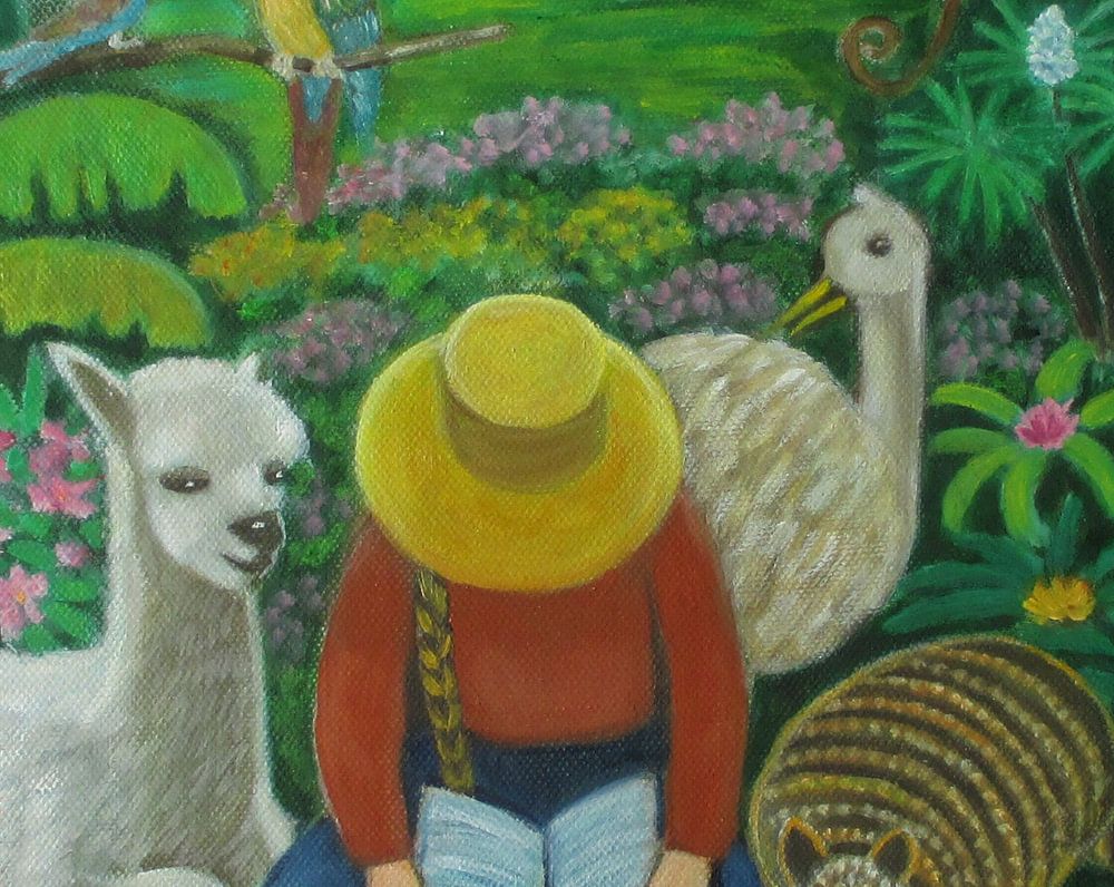 Somewhere in South America a woman is reading a story surrounded by a group of animals listening attentively.
