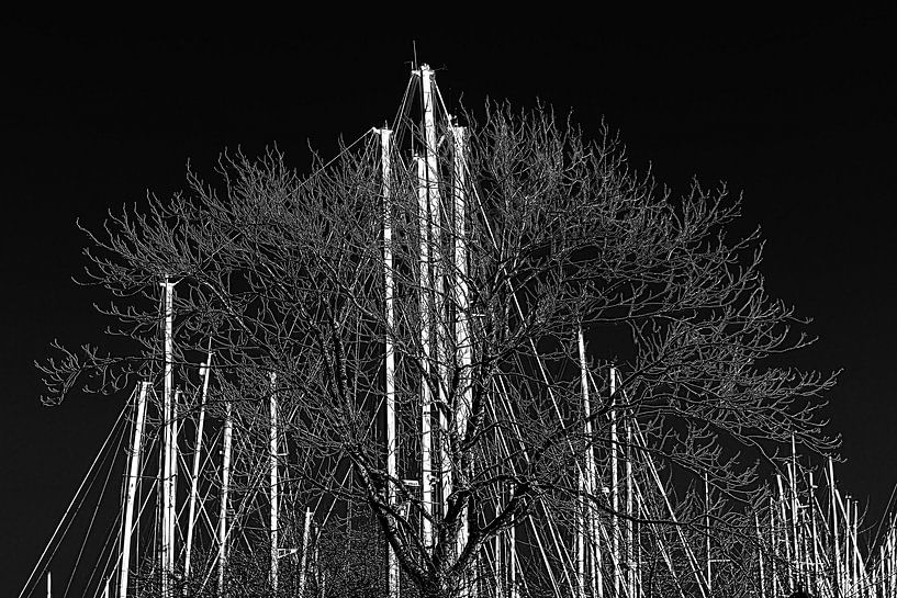 A whimsically branched tree at the edge of a harbour mooring provides a beautiful contrast to the straight white ship masts, which are beautifully lit from the right by the low winter sun.
