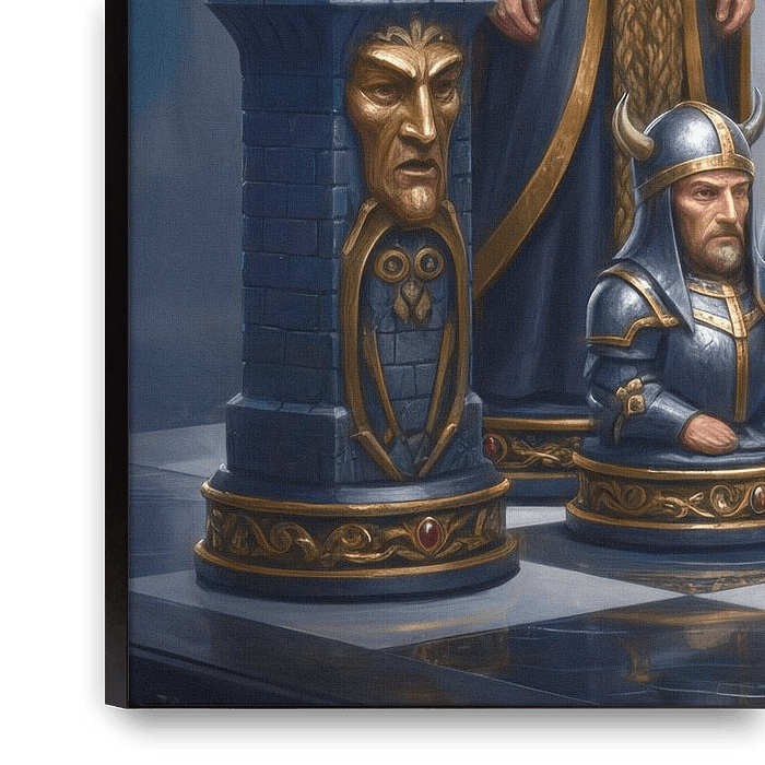 An elegant chess set with artistically designed pieces in royal attire – kings, queens and knights – stands on a mirrored board and exudes an aura of medieval fantasy.