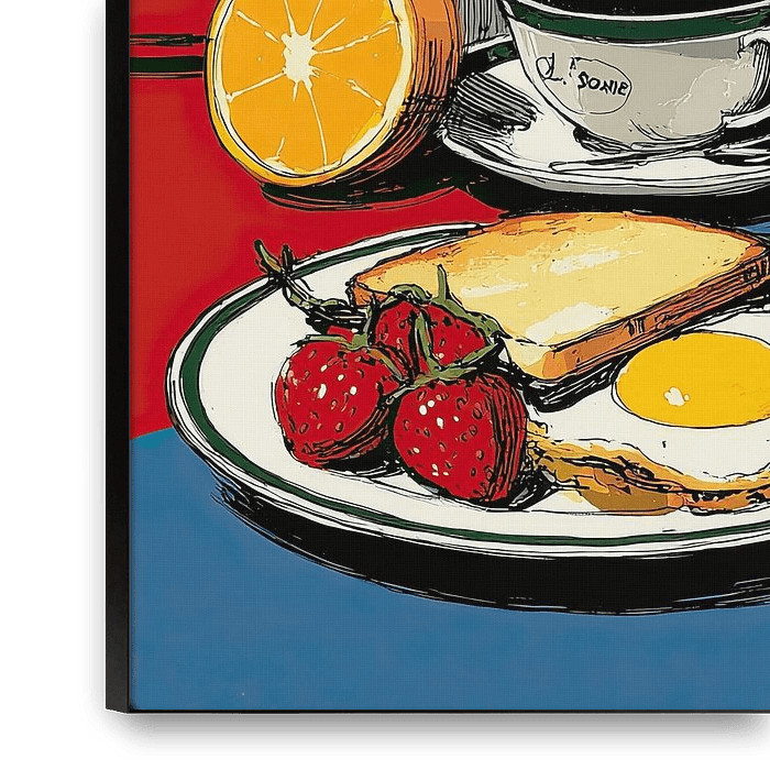 Details: breakfast painting, strawberries, fried egg, toast, orange…