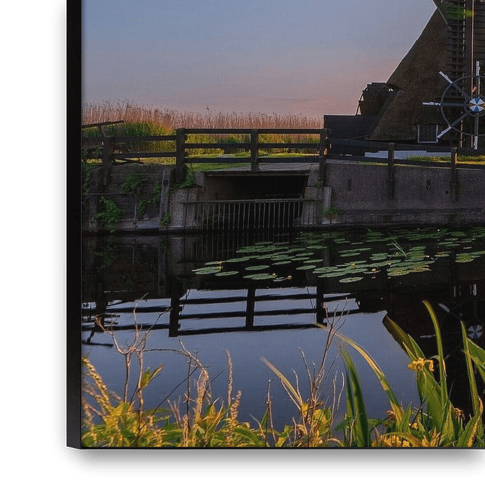 The Streefkerk mill during a beautiful spring evening where the sunset beautifully illuminates the mill. The lily pads in front of the water blooming. Small clouds adorning sky.