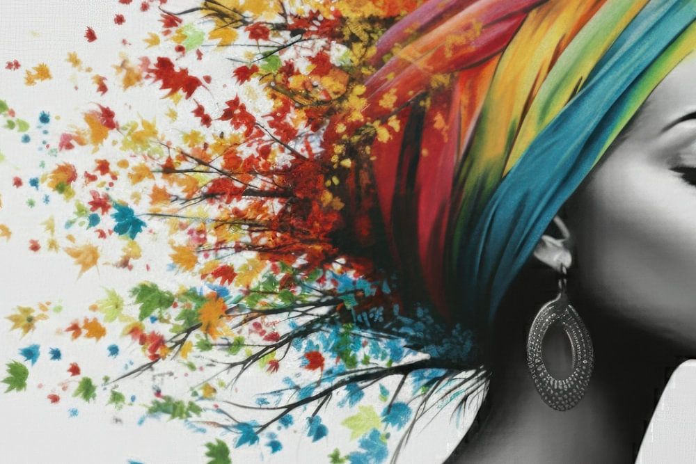 Keywords: street art painting, graffiti wall decoration, urban art, colourful portrait, female painting, BowiScapes, modern wall decoration, expressive art, vibrant painting, elegant artwork, design interior, bohemian wall art