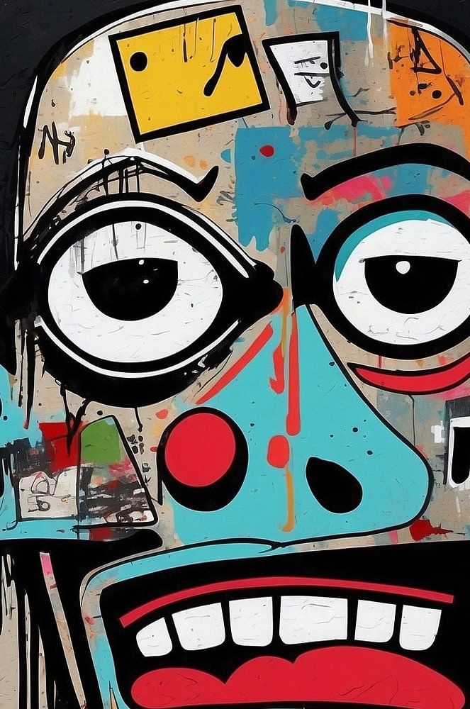 Street Fragments is an explosive and colourful work that captures the essence of urban art and abstract expressionism. The central face, with its bright red cheeks, big eyes and whimsical grin, is framed by thick black lines and dripping paint strokes that evoke a sense of raw energy. The background is composed of layers of turquoise, yellow, orange, pink and beige, with spontaneous shapes, collages and graffiti-like marks coming together in a dynamic and vibrant whole.