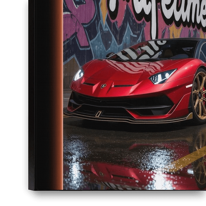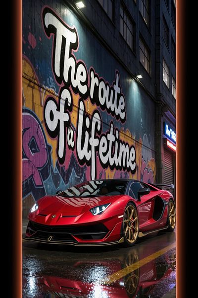 This vibrant red Lamborghini Aventador commands the street. Set against colorful graffiti with "The route of a lifetime," its sharp aerodynamic lines and gold rims reflect perfectly on the rain-slicked pavement.