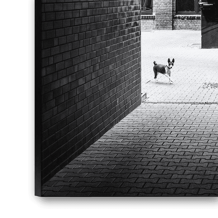 At the end of a house passage stands a small dog. In the background a graffiti of a kissing young man. Street photography from Berlin in black and white.