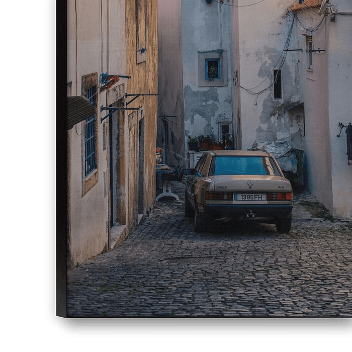 A view through a narrow street in the city of Lisbon in Portugal. The morning light contrasts nicely with the buildings, giving this photo a nice and pleasant feeling. The old Mercedes parked in the street completes the picture right?
