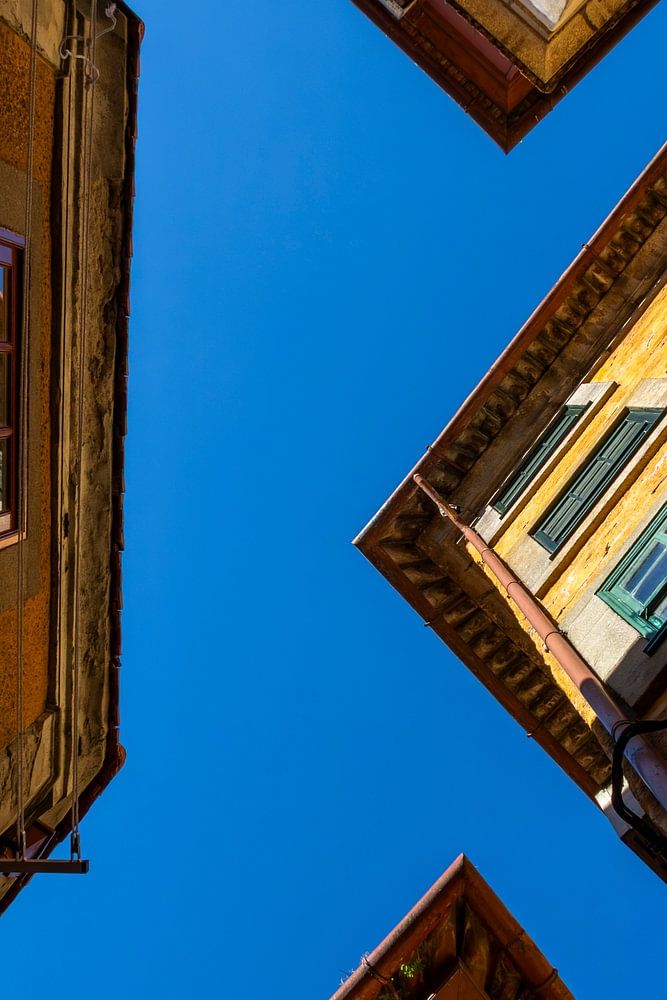 Four facades frame a clear blue sky, seen from a narrow street in Porto. The perspective from below emphasises lines, colours and textures, giving the city an almost abstract character.