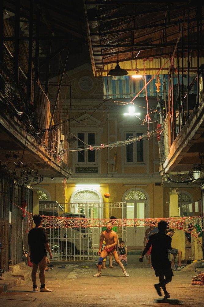Buy the photo Street scene at night: football in the courtyard by NZME Photography on canvas, ArtFrame, poster and wallpaper, printed on demand in high quality.