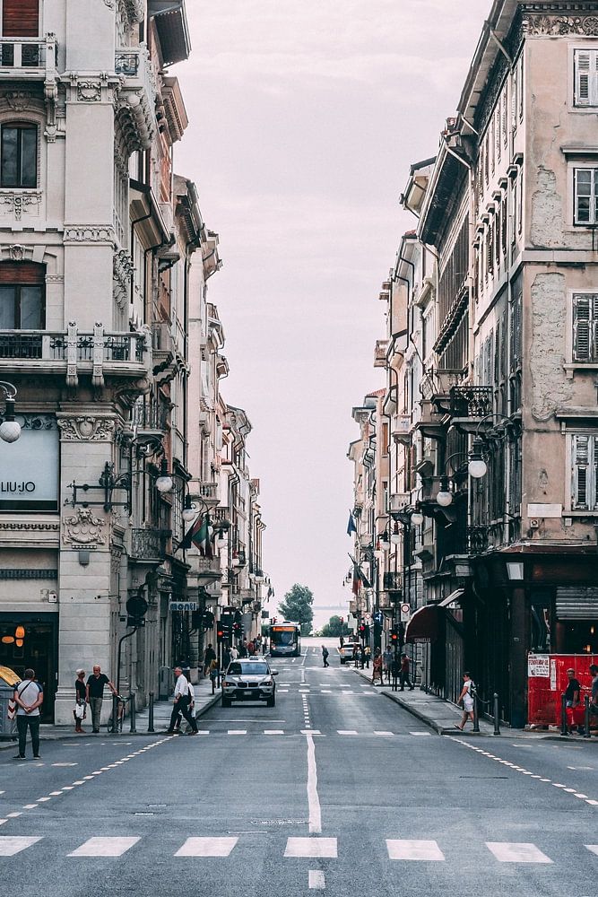 Street scene in Trieste showing the city's leading architecture, with the Adriatic Sea in the background.