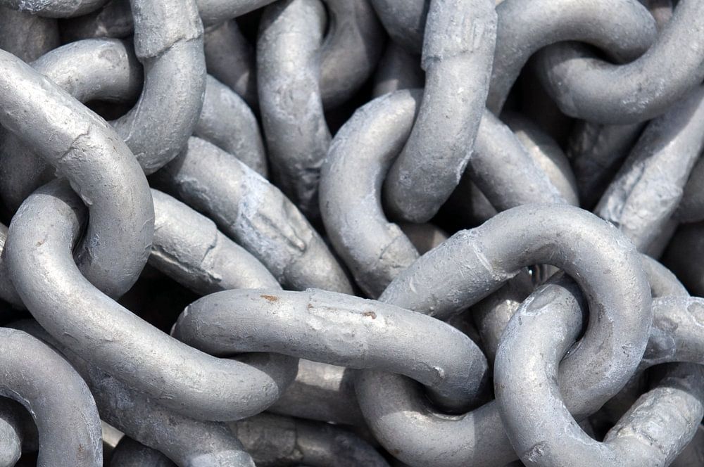 Close-up of an anchor chain, ready for sale. Anchor chains are strong. They make sure your boat stays where you drop the anchor, even in storms and currents.