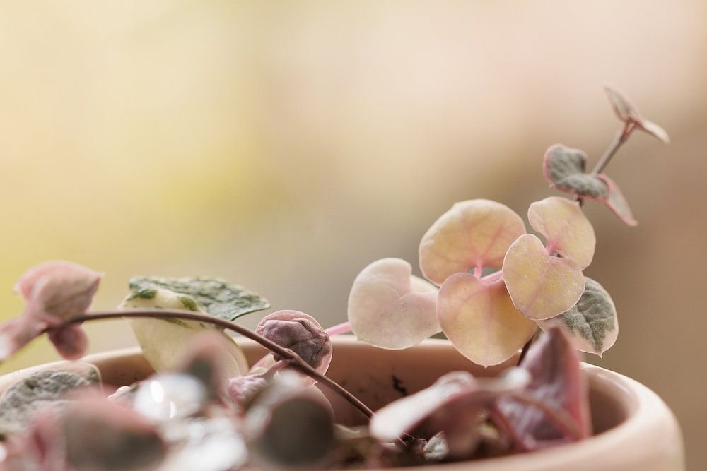 The official name of this plant is Ceropegia Woodii Variegata. The leaves are heart-shaped, making it a very attractive plant. The English name: String of Hearts is therefore very apt.