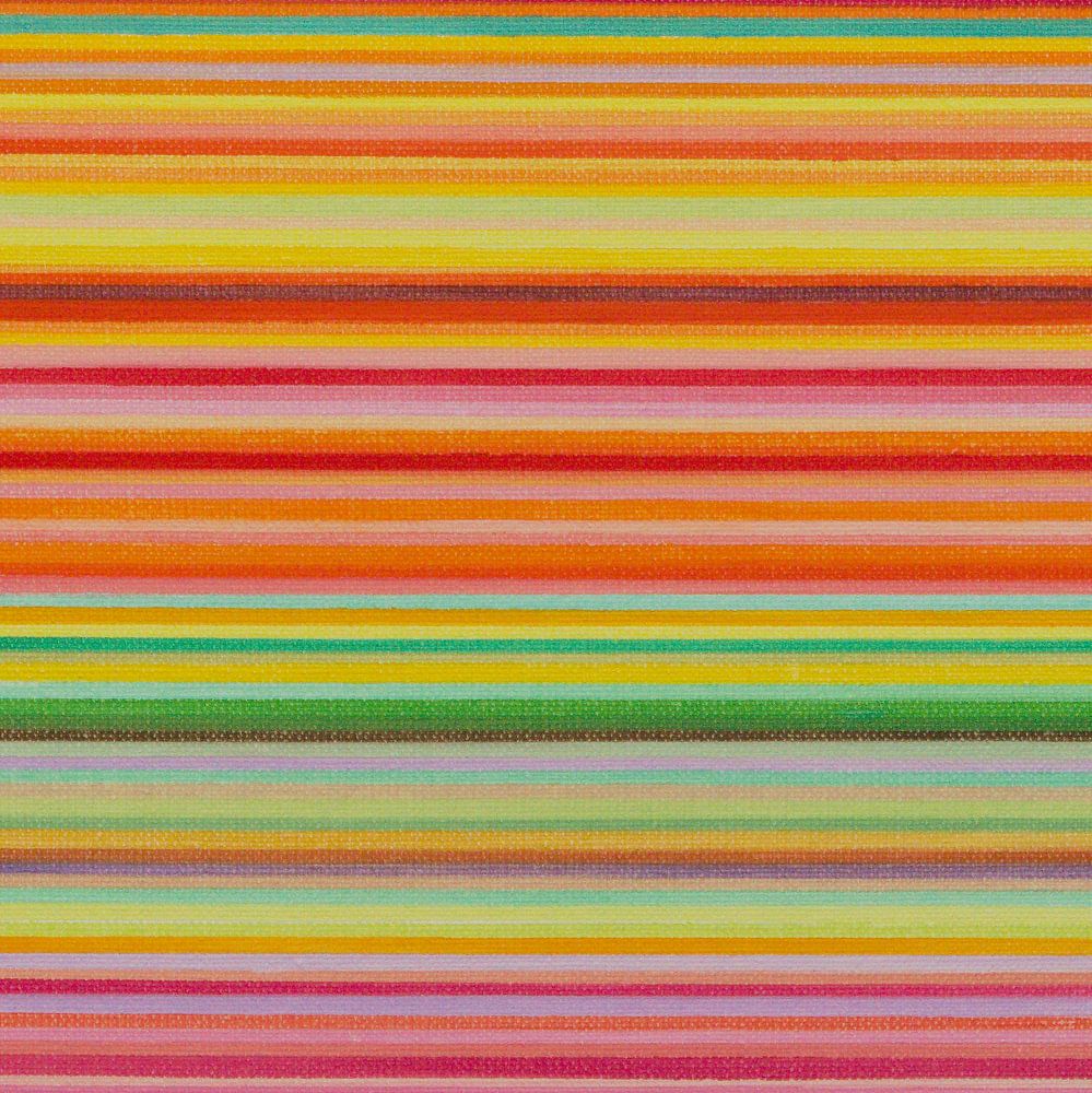 A painting with horizontal stripes in soft colours. The colours yellow, orange, pink, red, green and blue are beautifully combined in a pattern. The painting exudes tranquillity despite the many colours.