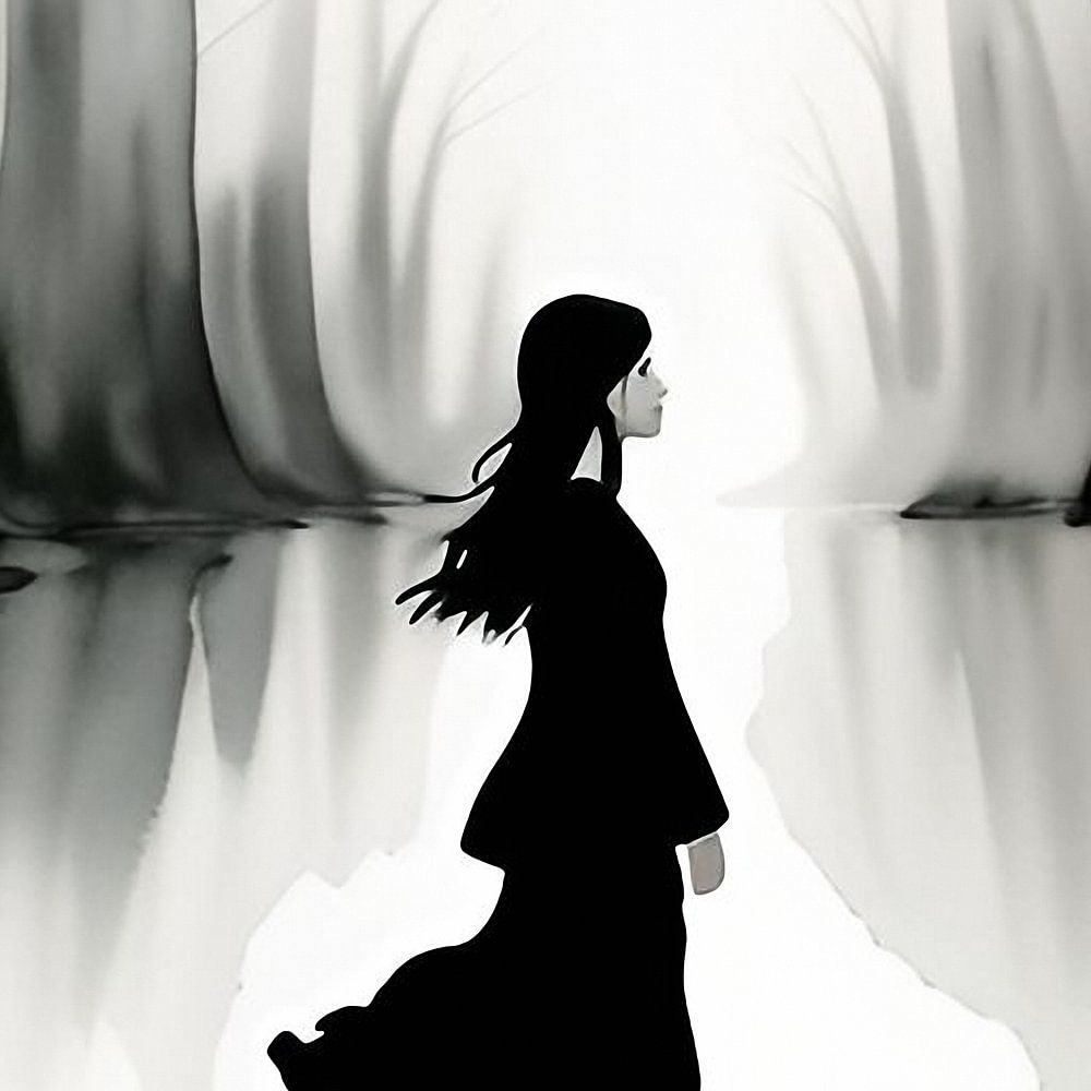 Young girl taking her nature walk. Painted in black and white with digital ink in digital style. A motif that makes everyone happy