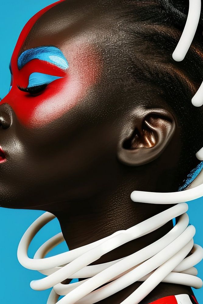 This stylish depiction combines bold colour accents with the elegance of deep black skin. The bright red and blue tones stand out strikingly and create a harmonious interplay of colour and form. The dynamic lines and geometric patterns give the picture a modern and energetic look. A must for contemporary art lovers looking for a…