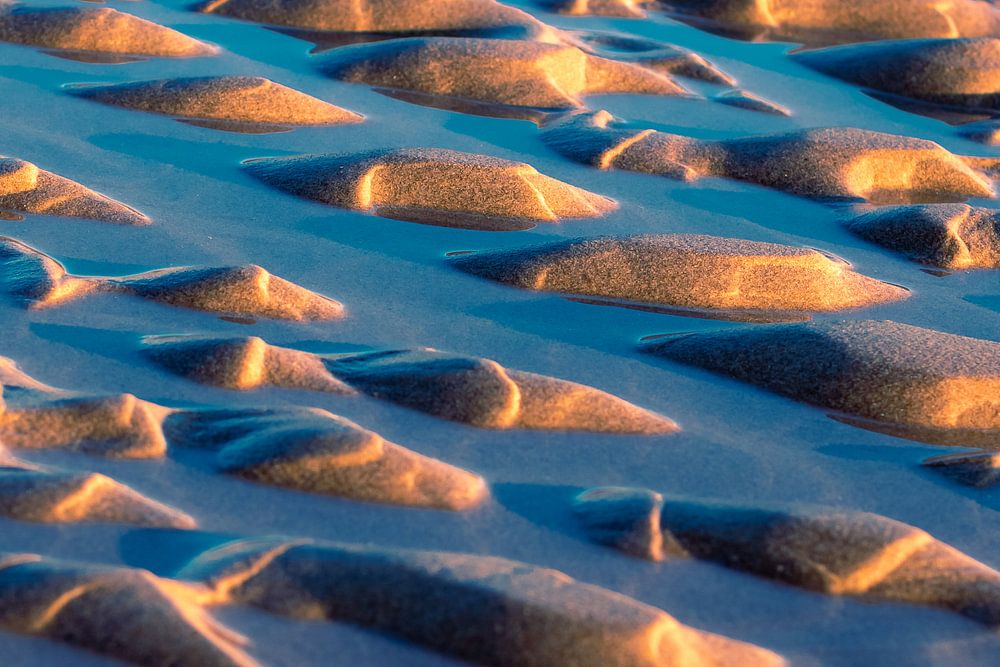 Structure of the sand after the seawater has flowed away. Part of the seawater is left behind between the accumulations of sand.