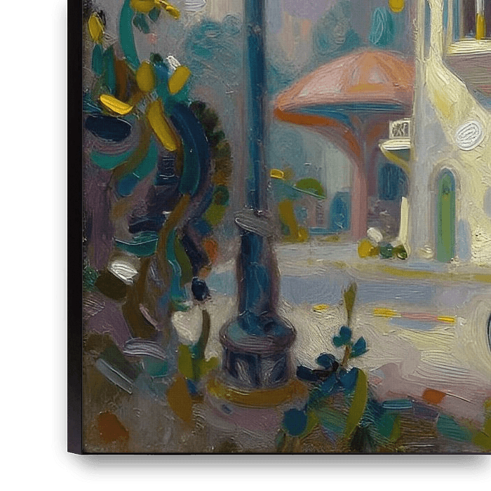 This Impressionist-inspired artwork transports the viewer to a fairy-tale cityscape where organic architecture meets soft pastel tones. The curved façades, whimsical balconies and gentle play of light create an almost surreal scene. In the foreground, a cyclist rides calmly through the scene, lending the picture a narrative dimension –…