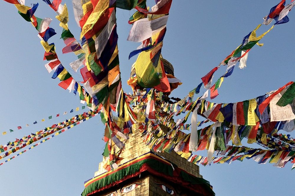 Kathmandu&#039s iconic stupa, with its Buddha eyes symbolising wisdom and all-knowing consciousness, is surrounded by multi-coloured prayer flags that rise to the sky, carrying wishes for serenity.