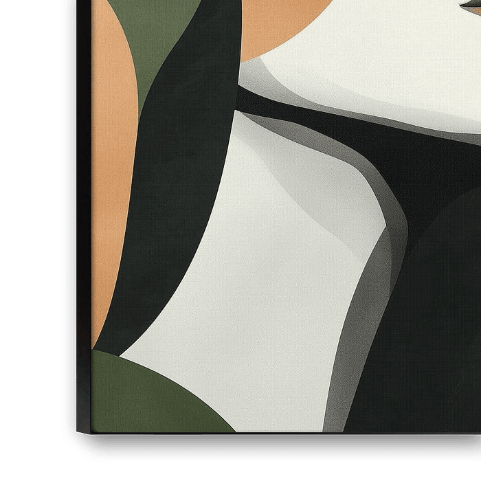 The composition consists of a play of colour areas in deep greens, soft beige tones and warm orange accents. The contrasts between light and dark, as well as the sharp lines and flowing curves, create a dynamic yet balanced image. The abstract shadows and the use of minimalist details give the work a modern and stylish look.
