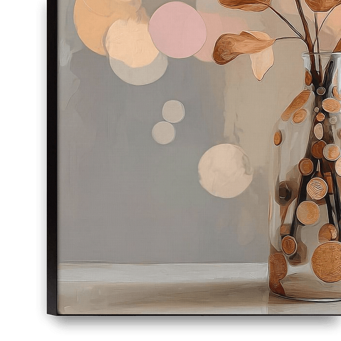 Let your interior shine with this stylish Christmas branch in warm Christmas tones! This beautiful artwork shows a graceful branch in vase, decorated with gold and pink accents that subtly twinkle like lights in winter. The combination of soft pastel colours, gold tones and a modern abstract design creates an elegant, festive atmosphere…