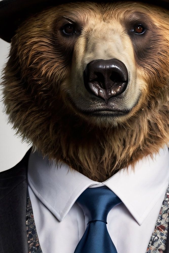 This design shows a unique and contemporary approach to surrealist art. An elegant bear is dressed in a sleek, stylish suit with matching hat. The contrast between the animal form and the sophisticated clothing style creates a striking and fascinating visual impact. This image combines humour with sophistication and will make a great conversation piece in any modern interior. Perfect for offices or living rooms where a touch of whimsy and class is desired. The combination of realistic details and a surreal scene makes this artwork ideal for lovers of eclectic and modern art.
