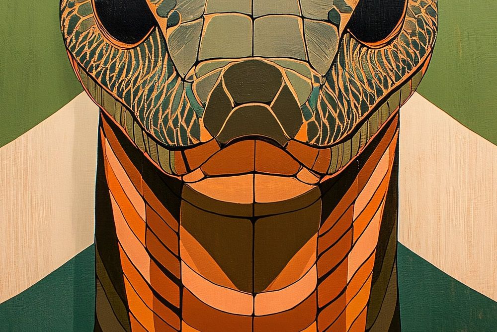 This stunning artwork captures attention immediately with its striking geometric style and warm colour palette. The cobra, powerful and intriguing, is depicted with refined details that together create a sense of dynamism and elegance. The design combines clean lines with flowing shapes, making it a perfect fit for modern interiors. The warm shades of orange and green give it a soothing, yet striking look. Ideal for lovers of unique animal art and a real eye-catcher in any room.