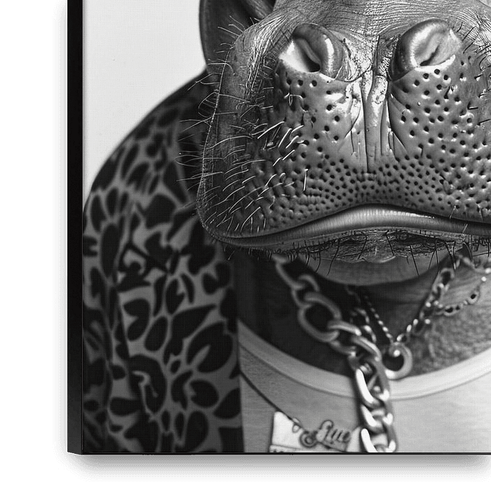 Buy this portrait Stylish hippo with sunglasses and hat in black and white by Poster Art Shop on canvas, ArtFrame, poster and wallpaper, printed on demand in high quality.
