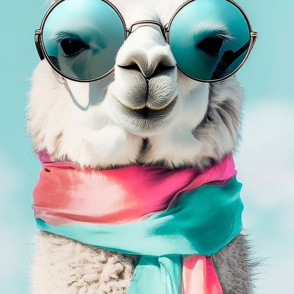 With a charming smile and cool sunglasses, this fluffy animal radiates pure relaxation. The colourful scarf blows gently in the wind and adds a touch of joie de vivre to the scene. Under the bright blue sky, the llama invites you to enjoy life to the full. Who could resist?