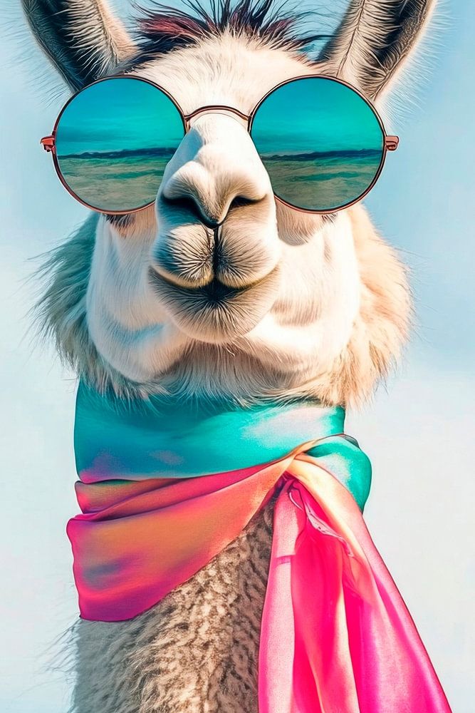 With cool sunglasses and a bright scarf, this animal trendsetter llama presents itself in all its splendour. It radiates self-confidence and nonchalance, while the clear sky in the background creates a relaxed mood. A real eye-catcher that will whet your appetite for adventure and good humour!