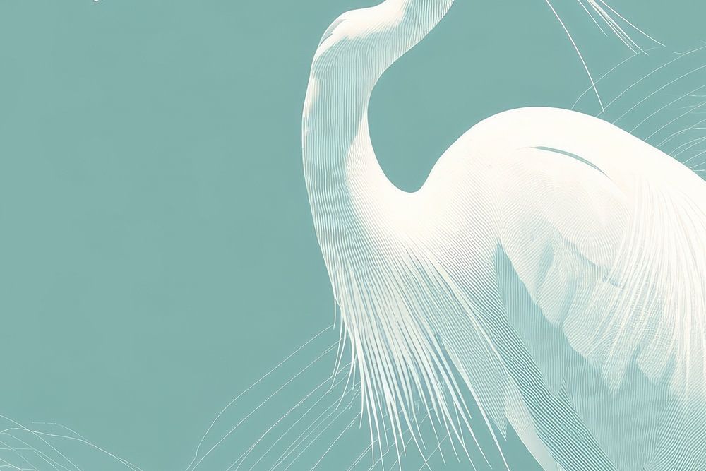 A delicate crane exudes grace and sophistication, depicted in soft white and mint green tones. The fine details in the feathers and subtle lines of the tail create an airy movement, while the calm background lets the bird shine in full splendour. The minimalist design highlights the natural elegance of the animal, perfect for interiors that want to exude tranquillity and timeless beauty.
