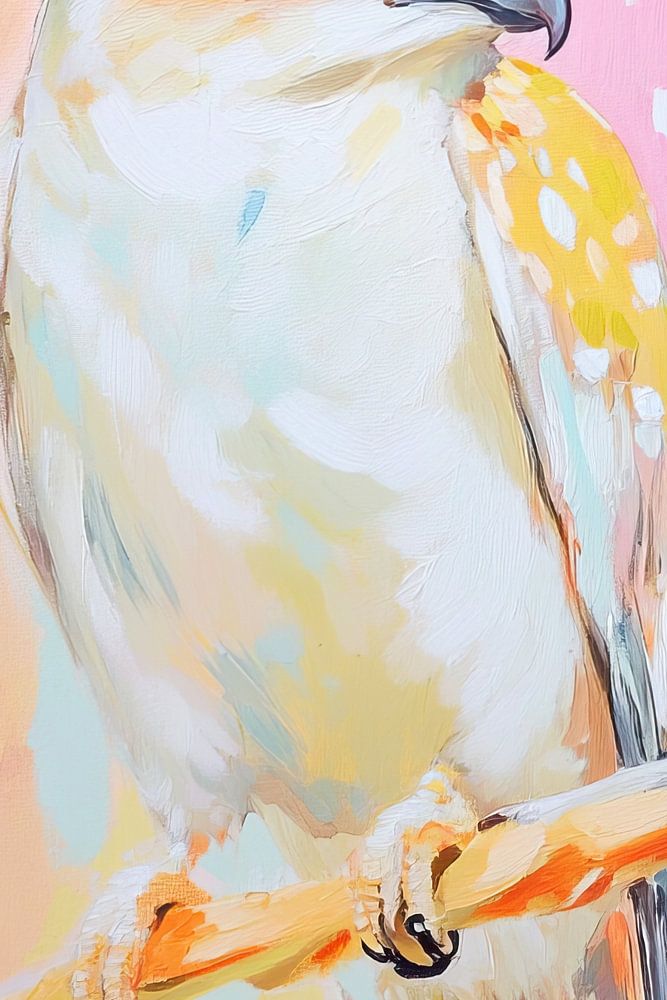 Summer Bird - This painting of a bird shows a beautiful, colourful bird with striking features sitting on a branch, surrounded by soft pastel colours that emphasise the cheerful atmosphere of summer.