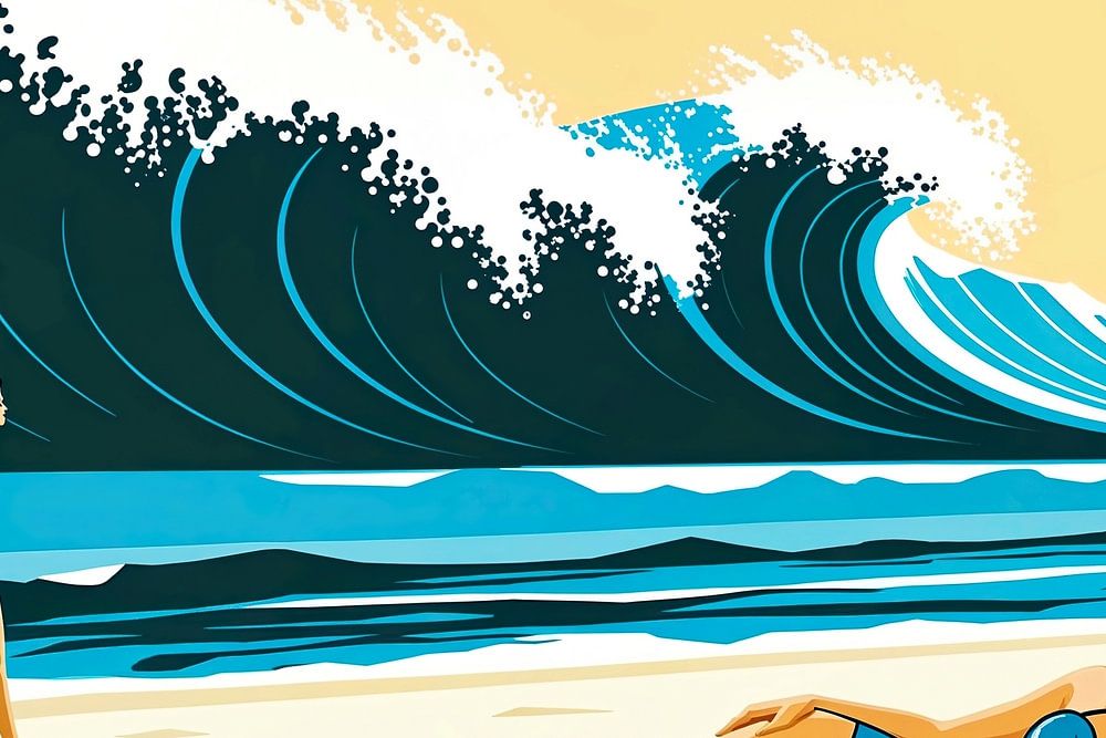 The image stimulates the imagination and invites interpretation: what does the huge wave symbolise? Is it a metaphor for life's unexpected twists and turns, or simply a playful addition to a summer scene?