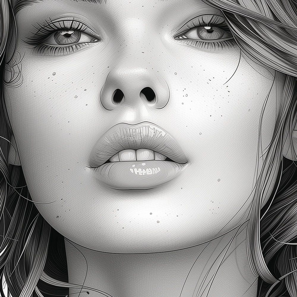 The detailed lines and shadows lend a deep realism to the portrait, while the soft curves of her face and lips evoke a sense of calm and sophistication. The subtle details, such as the delicate shadows and flowing lines, contribute to the dynamic yet calm look of the artwork.