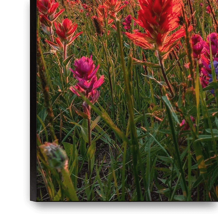 Photo of a beautiful sunset and Indian Paintbrush Wildflowers in the White River National Forest in Colorado.