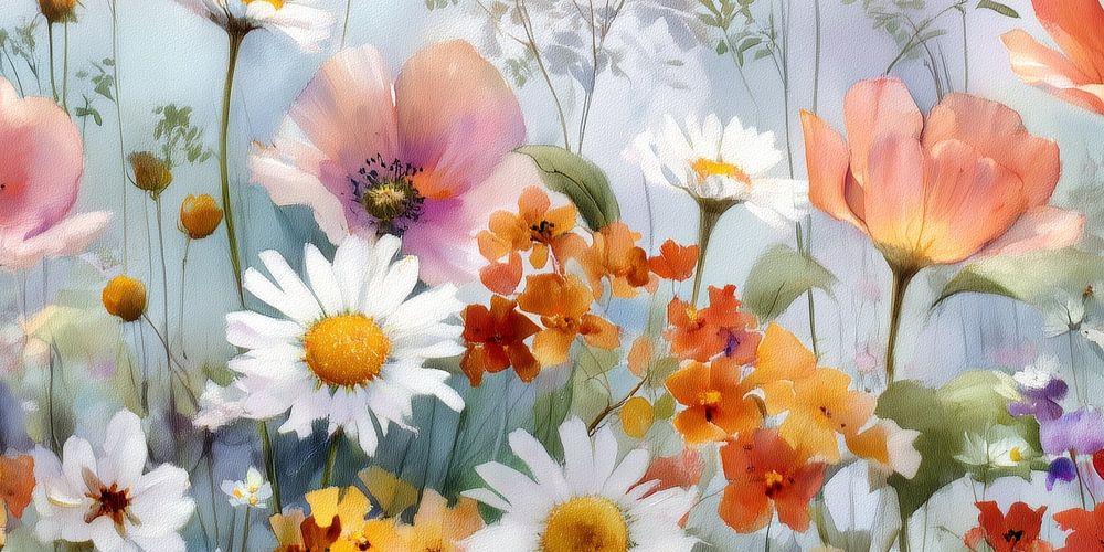 Wildflowers, daisies, poppies, meadow, watercolour, summer, blossoms, nature, garden, field, botany, pastel, impressionism, landscape, flowers, pink, orange, cornflowers, grasses, romance, vintage, decoration, spring, countryside, meadow