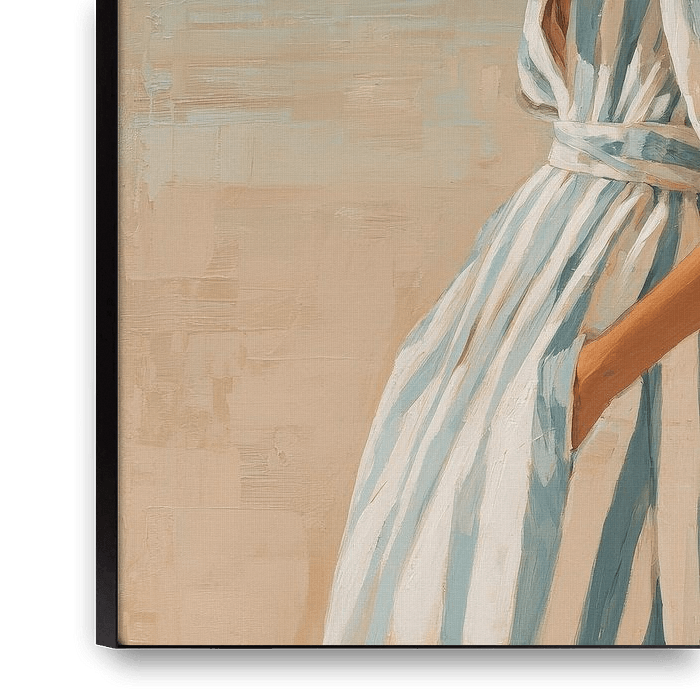 She is wearing a light dress with vertical blue and white stripes. The supple brushstrokes and warm skin tones give the work a…