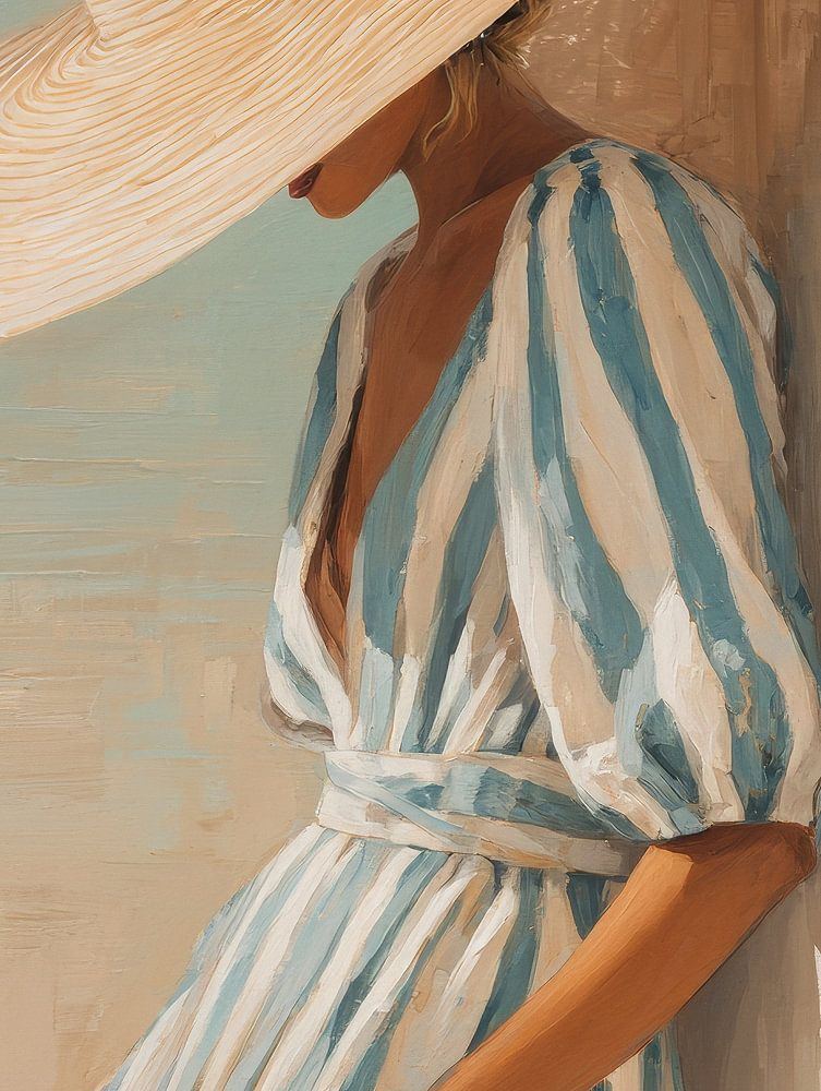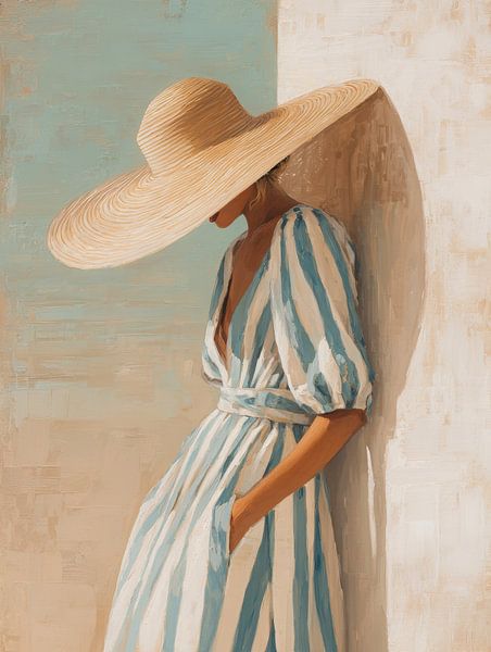 This atmospheric painting depicts an elegant woman leaning casually against a light-coloured wall. Her large straw hat casts a soft shadow over her face, creating a sense of mystery and tranquillity.