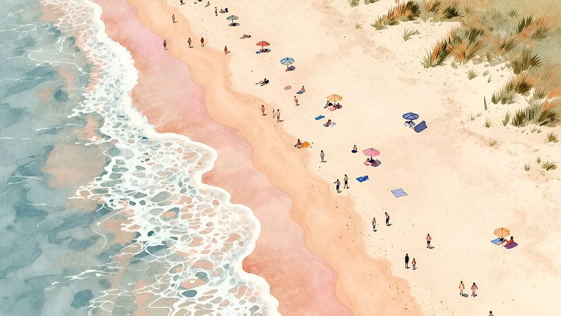 From a bird's eye view, a wide beach landscape opens up, where the sea rolls onto the warm sand in soft shades of turquoise and pink. The waves draw organic, almost abstract patterns along the coastline.