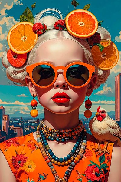 A surreal image of a beautiful girl with white blonde hair in a retro style. Her hair is adorned with orange slices and red berries, small berries hang from her earrings, and a little chicken sits on her shoulder. The beaded necklace is extravagant and her outfit is orange with a floral pattern, giving the whole scene a retro feel. A…