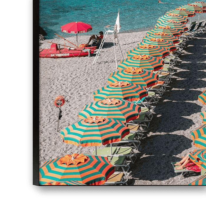 Photo print of Monterosso beach. Enjoy the clear blue sea water, warm sand and brightly coloured umbrellas.